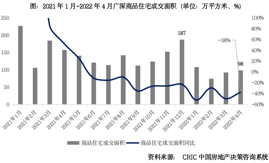 至2022年4月广深两城合计成交一手房98万平方米,同比下降38%。虽3-4月成交规模同比降幅较1-2月有所收窄,但仍处于历史低点。4月单月成交规模不足2021年高点一半。