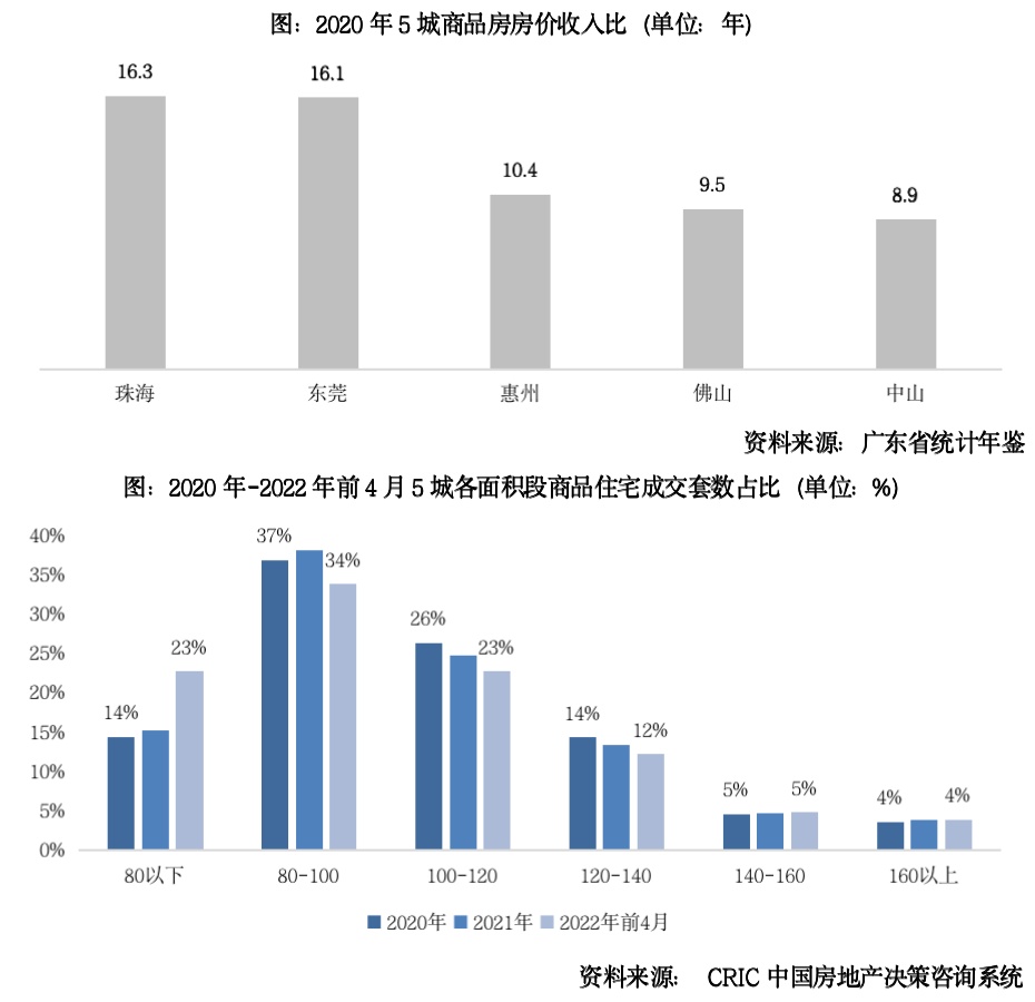 此外从成交结构来看,对比5城2020年和2022年前4月各面积段商品住宅成交占比,80平方米以下住宅占比上升8pcts至23%,80-100平方米和100-120平方米占比均下降3pcts。与住宅成交面积小型化相对应的是,改善的大面积占比逐年下降,120-140万平方米占比下降2pcts至12%。东莞和佛山140平方米以上住宅占比也均有降低。