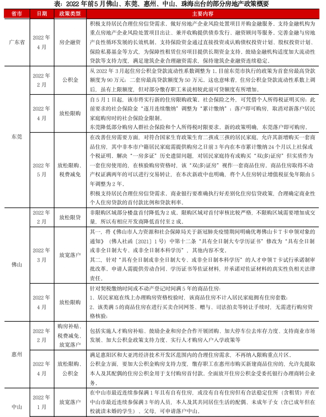 具体来看,4月广东省在整体宗旨上明确积极支持居民合理住房信贷要求,且支持为重点房地产企业提供债券发行服务;鼓励金融机构适度加大流动性贷款支持力度,保持建筑企业融资连续稳定。而在此之前,东莞、佛山、惠州、中山等已是新政连连。