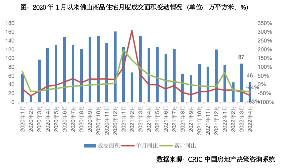 步入2022年以来,整体全国行情低迷的背景下,佛山也不例外,成交延续低位波动,4月由升转降,单月成交量仅为46万平方米,单月同比和累计同比降幅持续扩大,已达63%和44%。