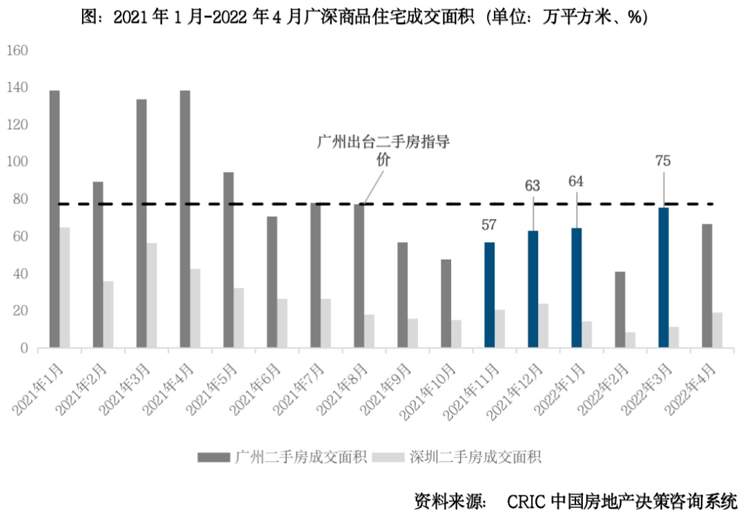 截至2022年5月,广州仅针对房贷利率略有下调,但普遍执行的5.2%-5.4%仍高于5年期lpr75bp。深圳仅出台了防疫纾困政策,扩大“六税两费”减征范围。此外广州在2月两度发文辟谣一手房和豪宅限价放松的传闻。