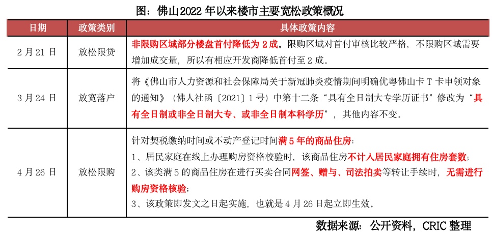 佛山是典型的政策敏感型市场,政策既是需求强弱转化导火索,也是周期波动的催化剂。事实上,2022年以来,福州纾困政策不断,2月降首付,非限购区域部分楼盘首付低至2成,3月放宽落户,人才t卡申领门槛由全日制大专降至非全日制大专亦可申领;4月更是放松限购,限购区满5年二手房不再纳入限购套数之中。