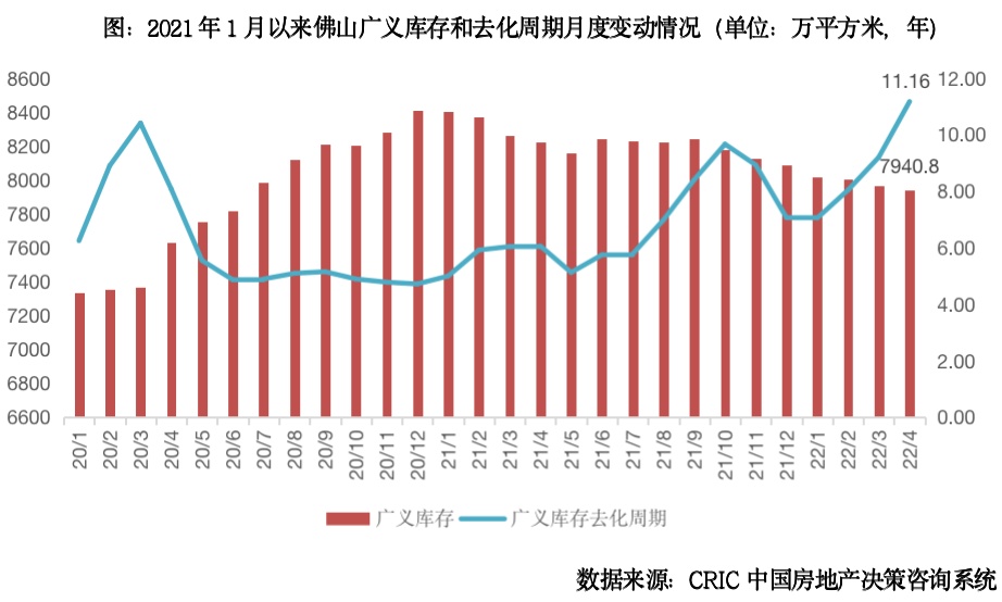 不过从政策效果来看,对市场提振作用相对有限。我们认为,原因无外乎以下几点:一是广佛楼市联动性较强,广州当前楼市尚未完全复苏,广州外溢需求购房积极性不高,目前观望情绪浓厚,整体市场信心不足;二是落户门槛“一降再降”,人才新政对楼市提振呈边际效应递减。早在2019年12月,佛山放开各类人才购房限制,在本市工作、具有本科及以上学历或中级工及以上职业资格的人才,购买首套房不受户籍、个税、社保限制。此后更是进一步调降人才落户门槛,不得不说,人才新政早期的确能刺激了一波增量需求释放,但是随着这波需求释放完毕,对于楼市的支撑作用越来越难以维继。三是因前期供地过量叠加成交低迷导致广义库存压力稳中有增。事实上,佛山广义库存高企,截止2022年4月末已近8000万平方米,在全国排名靠前,去化周期超11年,供需失衡也导致了居民短期购房热情并不高涨。