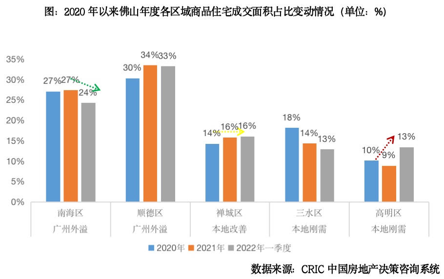 相较于本地改善性需求以及底层刚需,广州外溢需求才是决定佛山市场周期性变化的核心动因。主要原因在于广佛已迈入全域同城化的新阶段,对于居住生活在广州主城区的客群而言,佛山下辖的南海区、顺德区已然成为广州外溢需求重要承接地,市场价值远高于广州下辖的增城、从化这类远郊区域。区别于佛山本地自住以及改善性需求,广州外溢客群基数更为庞大,并有较强购买力支撑,成为主导佛山市场冷暖变化的主要因素。而这部分需求目前相对疲软,这也是导致佛山楼市成交低迷的主要原因。