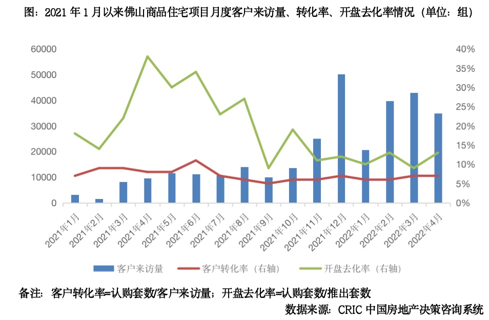 而从项目来访、开盘去化等微观层面来看,整体去化率自2021年4月以来便开始波动下行,2022年开年至今基本持稳在10%左右,4月虽略有回升至13%,但尚属阶段性底部。而从客户来访量和转化率来看,“看得多,买得少”观望情绪更加浓厚,据cric监测数据,2022年2-4月月均客户来访量基本都在3.9万组左右,处于2021年以来高位,但客户转化率仅为6%-7%,尚无明显提升。