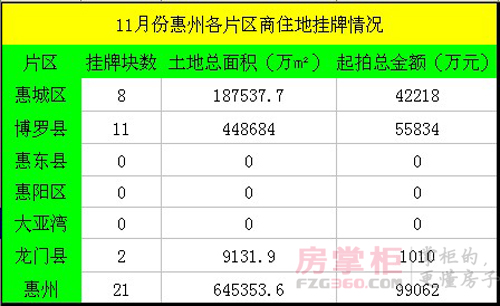 经历半年的土地低迷后,10月惠州土地市场迎来一波“热潮”。而11月份,惠州土地市场也不减推地热度,据房掌柜不完全统计,整个11月份,惠州地区将推出21块商住地,总面积达到64.5万平米,起拍总金额约10亿元。从挂牌数量和挂牌总面积看,环比比10月份均有所上涨;甚至还超过去年同期水平。