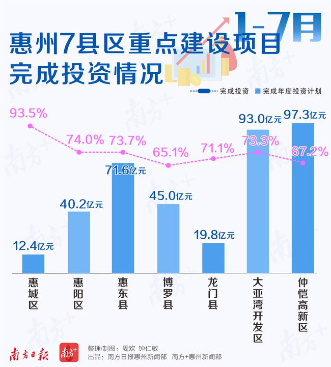 惠州市发改局的数据显示,1-7月,惠城区、惠阳区、惠东县、博罗县、龙门县、大亚湾开发区和仲恺高新区分别完成重点项目投资12.4亿元、40.2亿元、71.6亿元、45.0亿元、19.8亿元、93.0亿元和97.3亿元,完成年度投资计划93.5%、74.0%、73.7%、65.1%、71.1%、73.3%和67.2%。